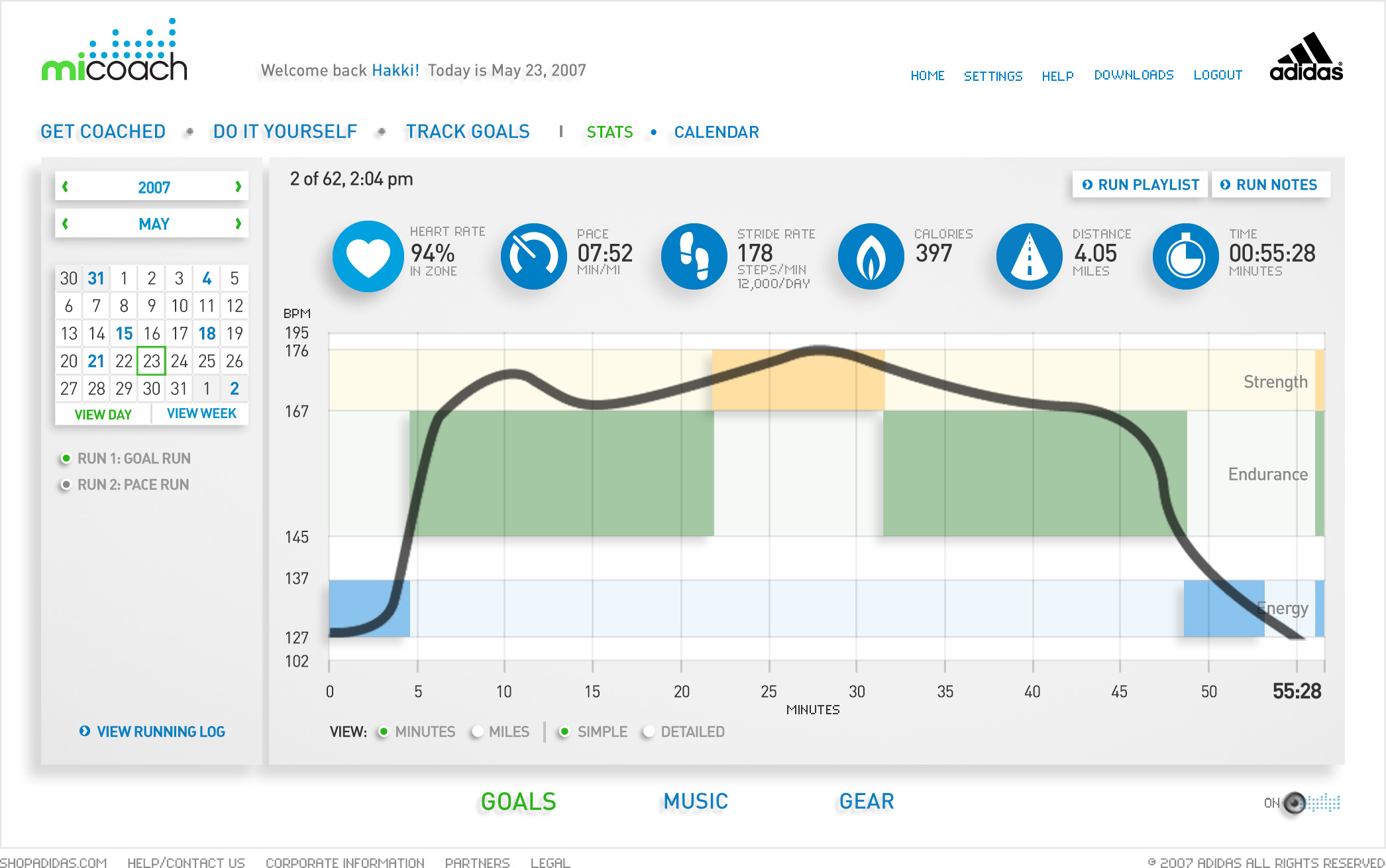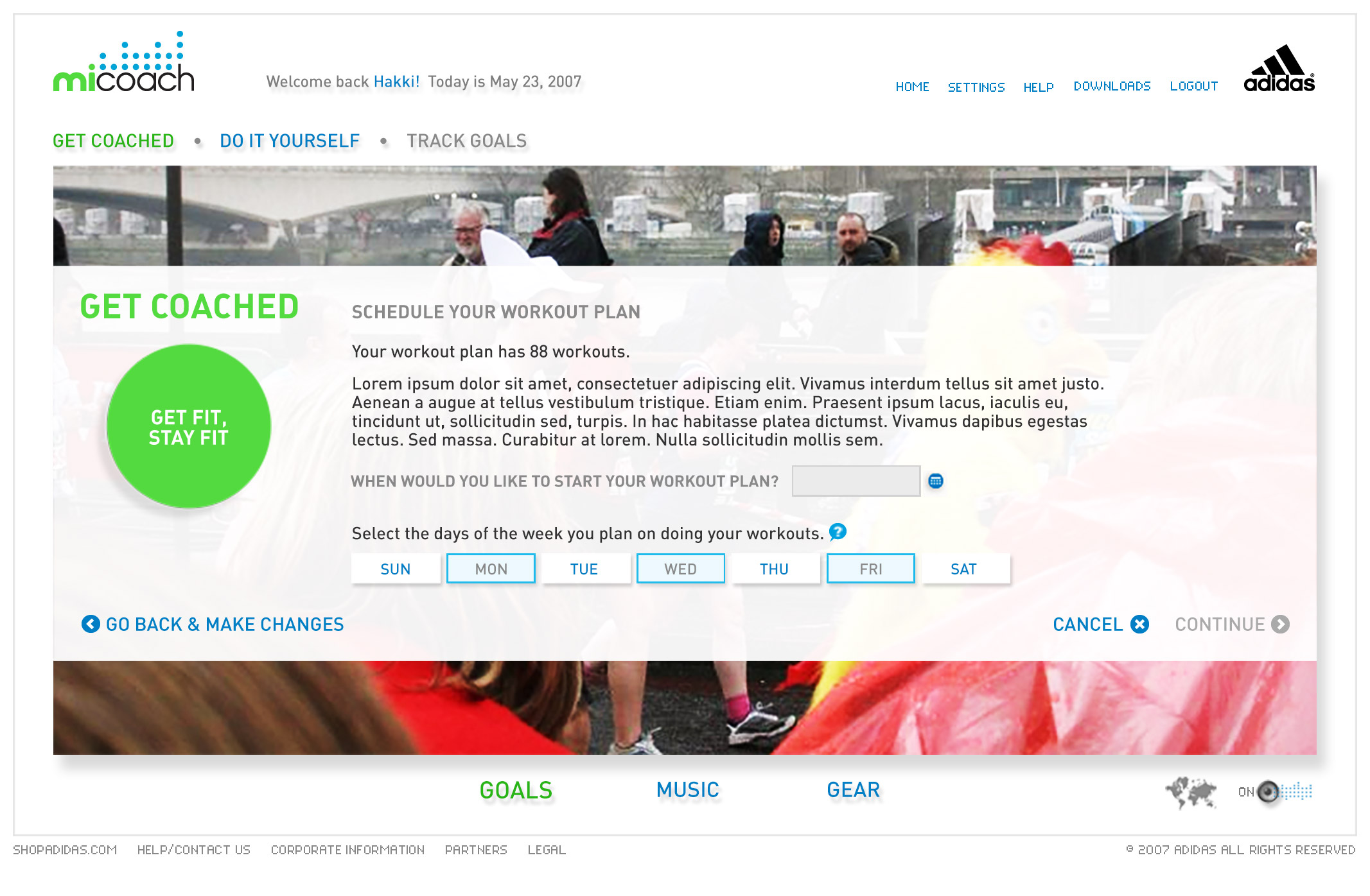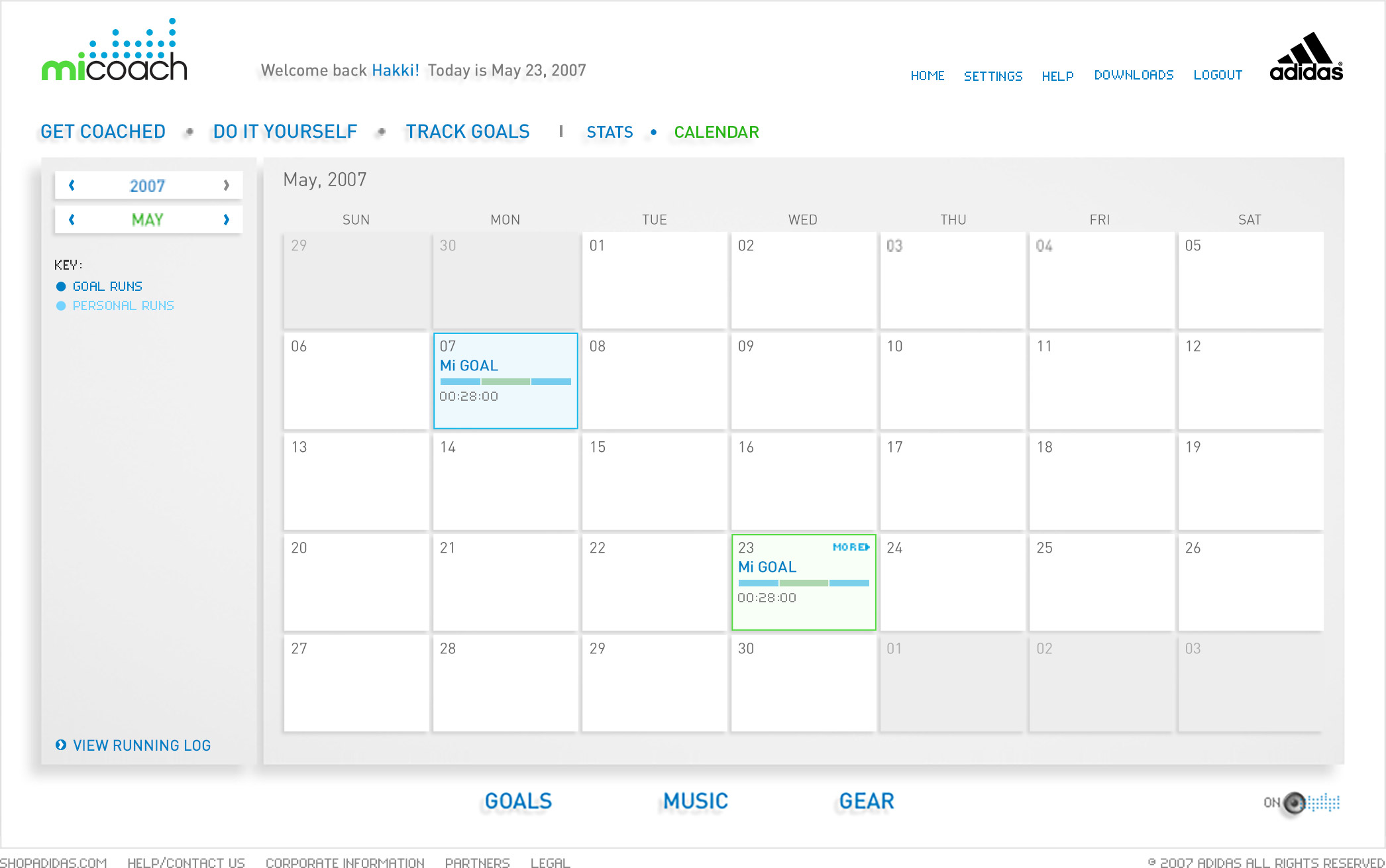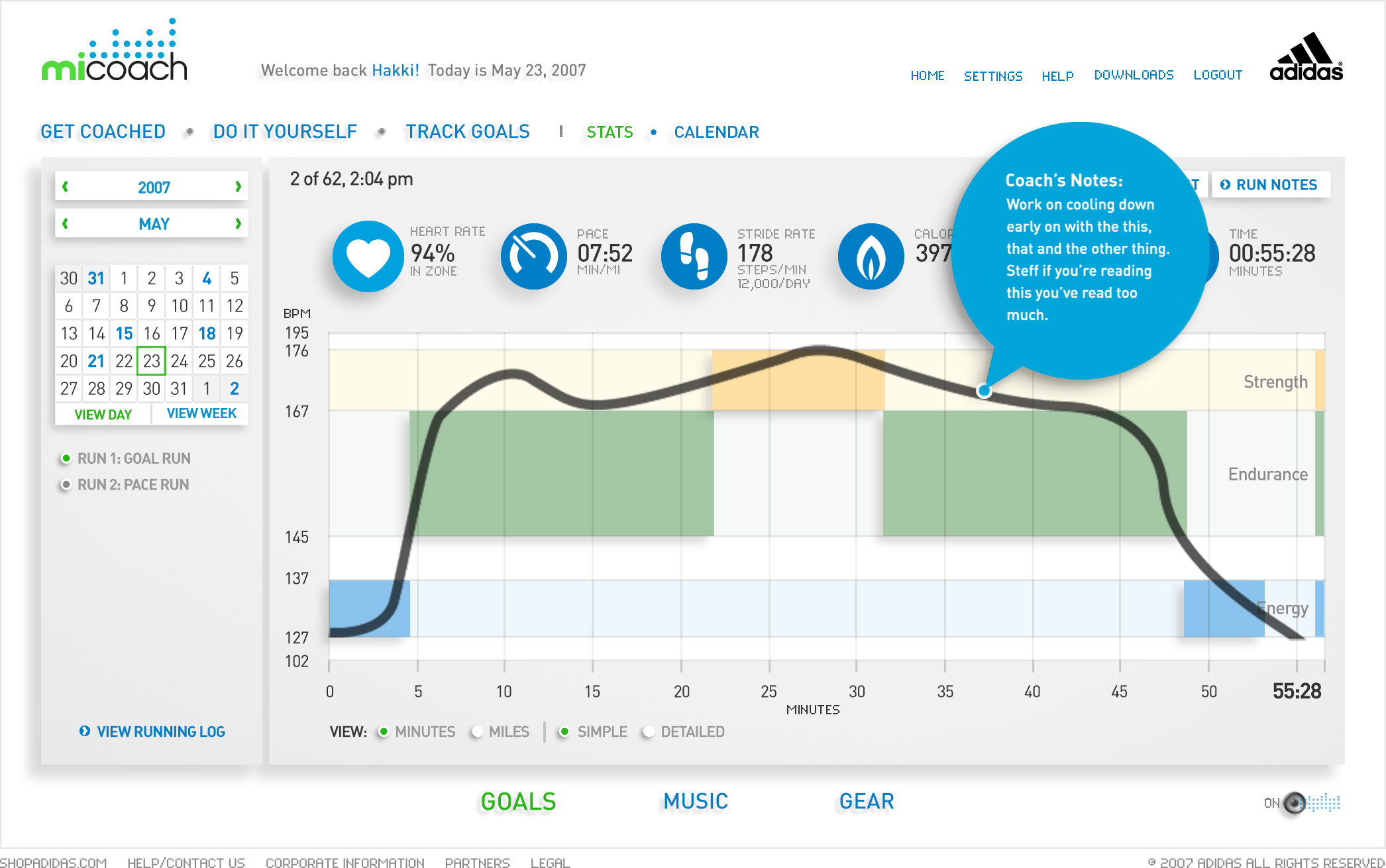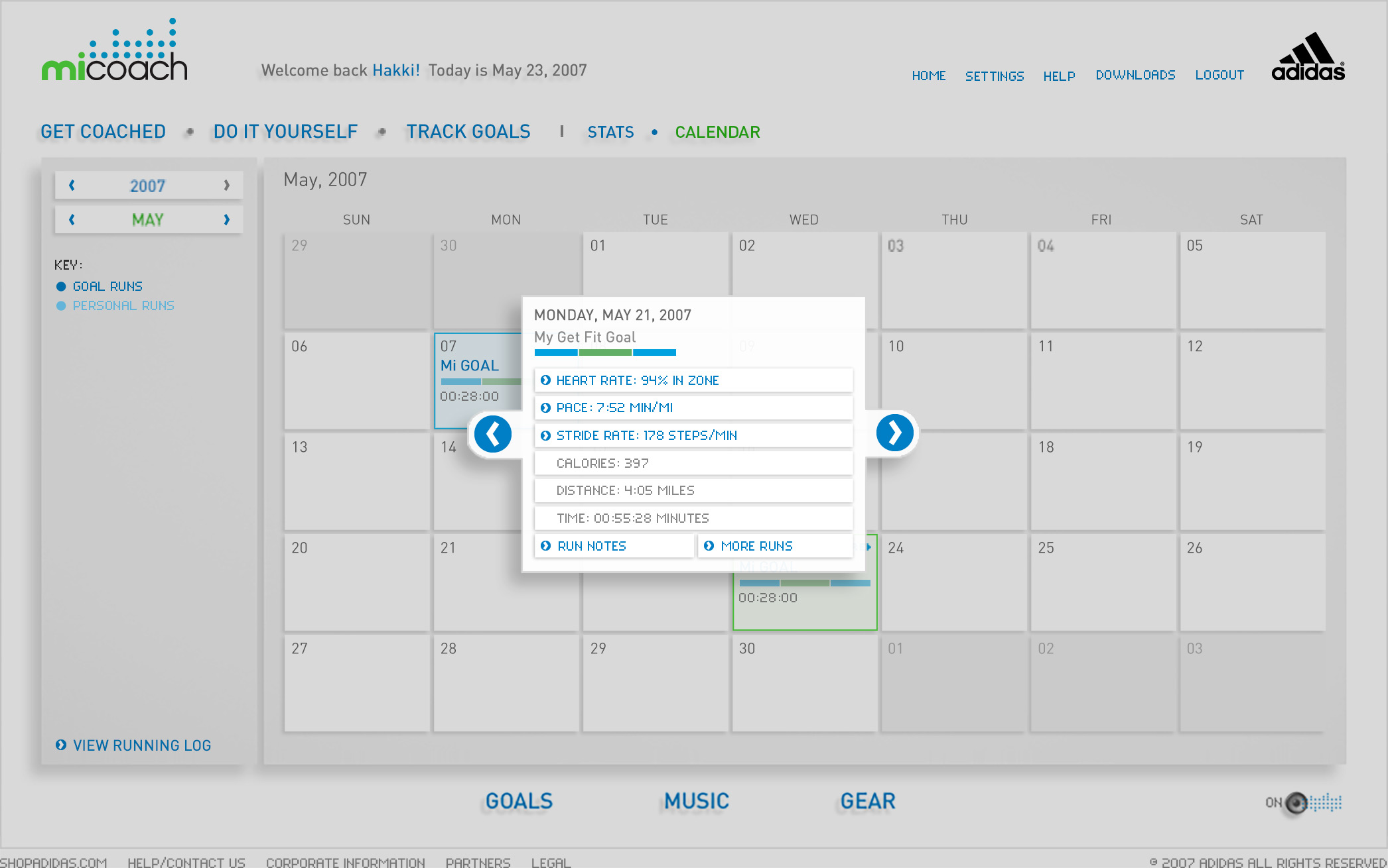 miCoach is the first initiative in a partnership between two of the world's leading brands, Samsung and adidas. It's a personal coaching system that challenges you and supports you to stay motivated and on track with personalizable goals via real time voice coaching, zone based cardio training, detailed workout analysis, tips and nutrition advice from adidas' elite coaching partners and ambassadors. The design goal was to provide a very clean and user friendly mission control, where each runner can set a goal, receive a personalized plan, monitor their progress over time.