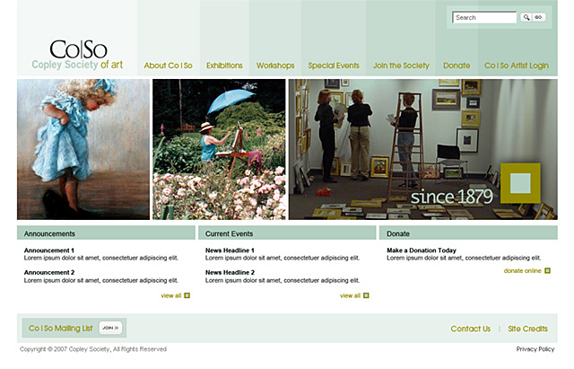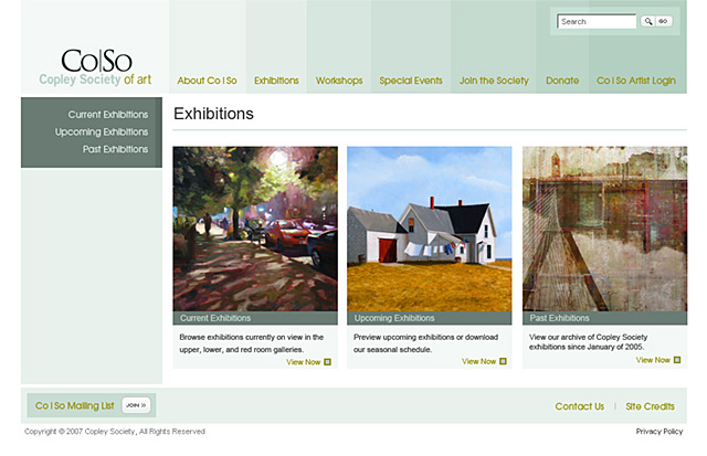 The Copley Society of art, Co|So, is the oldest non-profit art association in the United States, with a history dating back to 1879. The site was designed and built to be very lightweight using only CSS, providing fast and focused access to artists, exhibitions, workshops and special events.