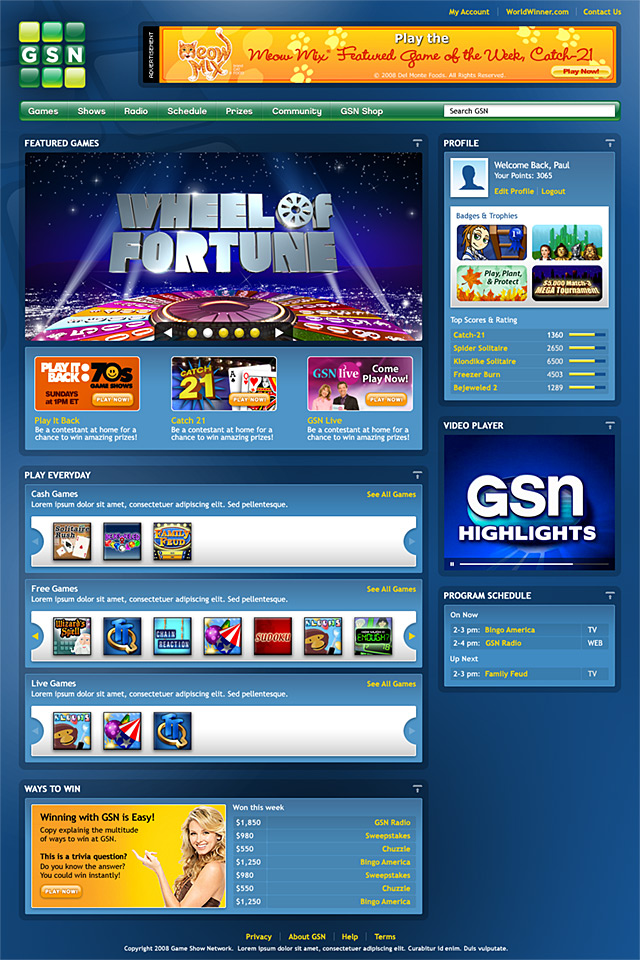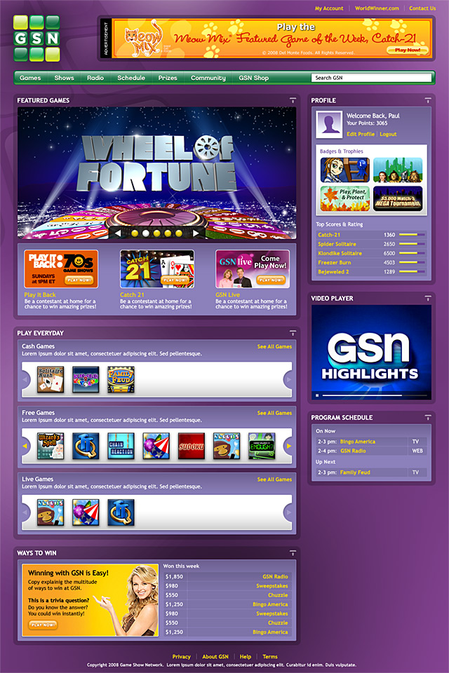 GSN is an industry-leading, game content provider distributing competition programming through its subscriber cable television network and its online games portal. In this proposed design direction the goal was to provide GSN users with a fresher, more personalized online experience that bridges the cable TV and online mediums.