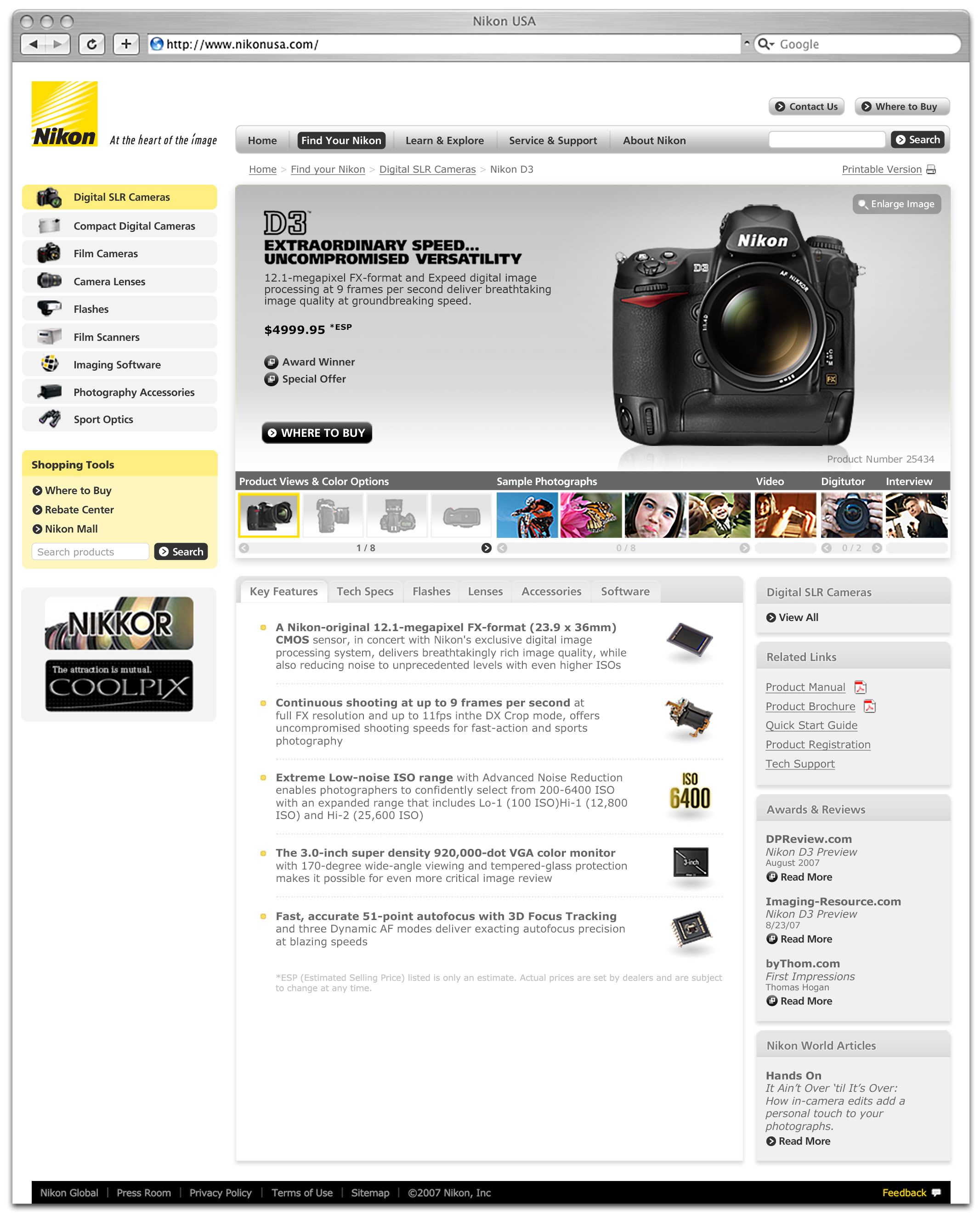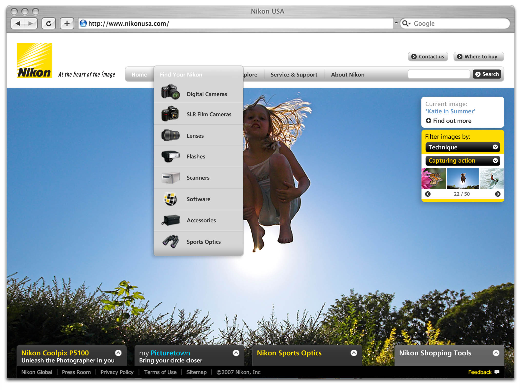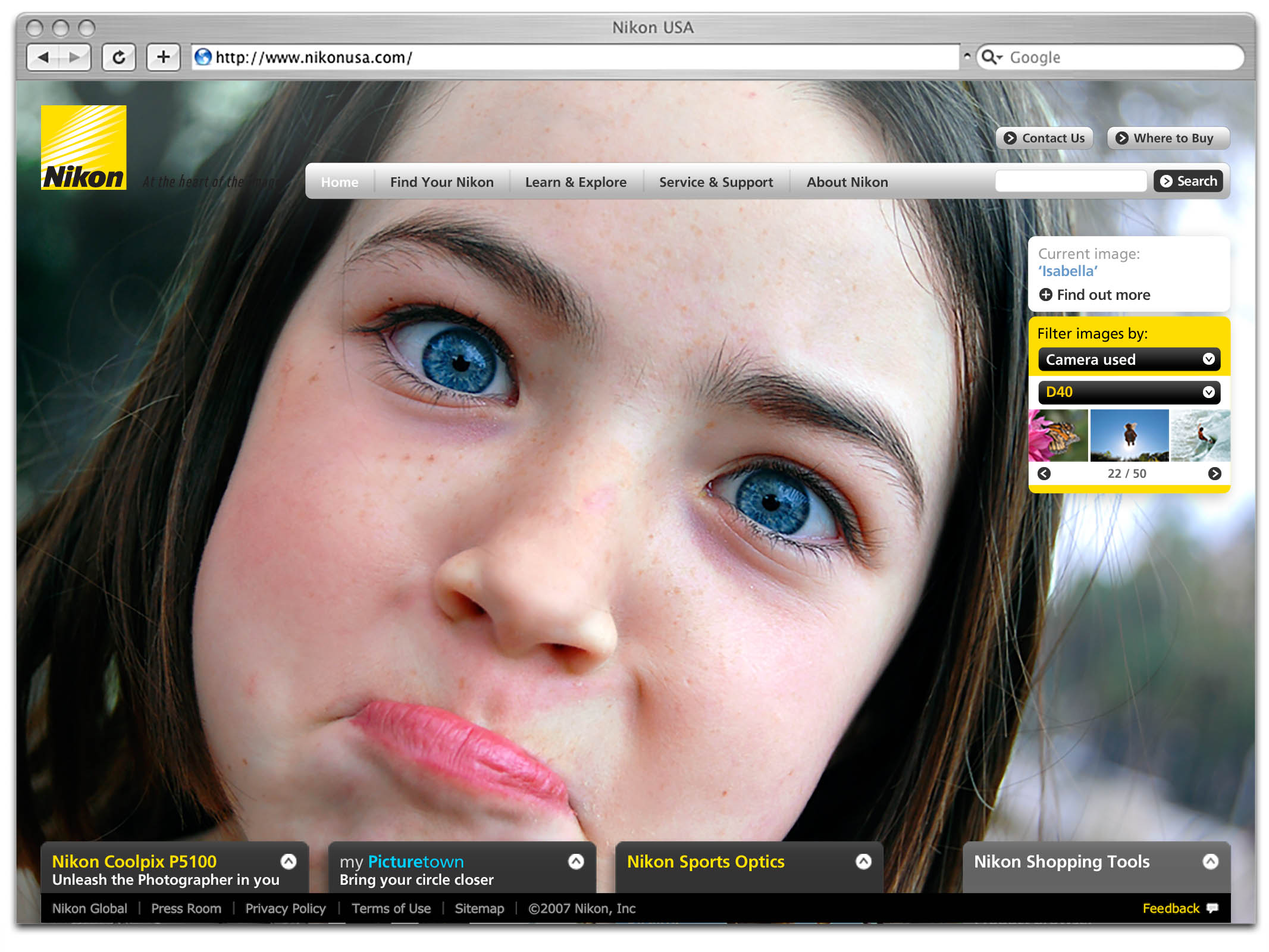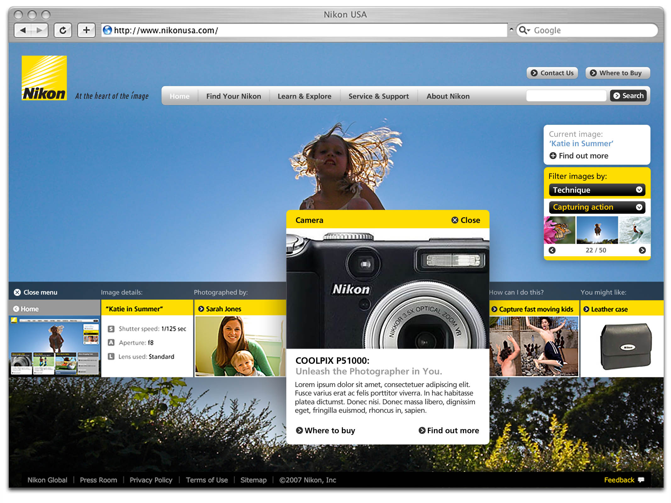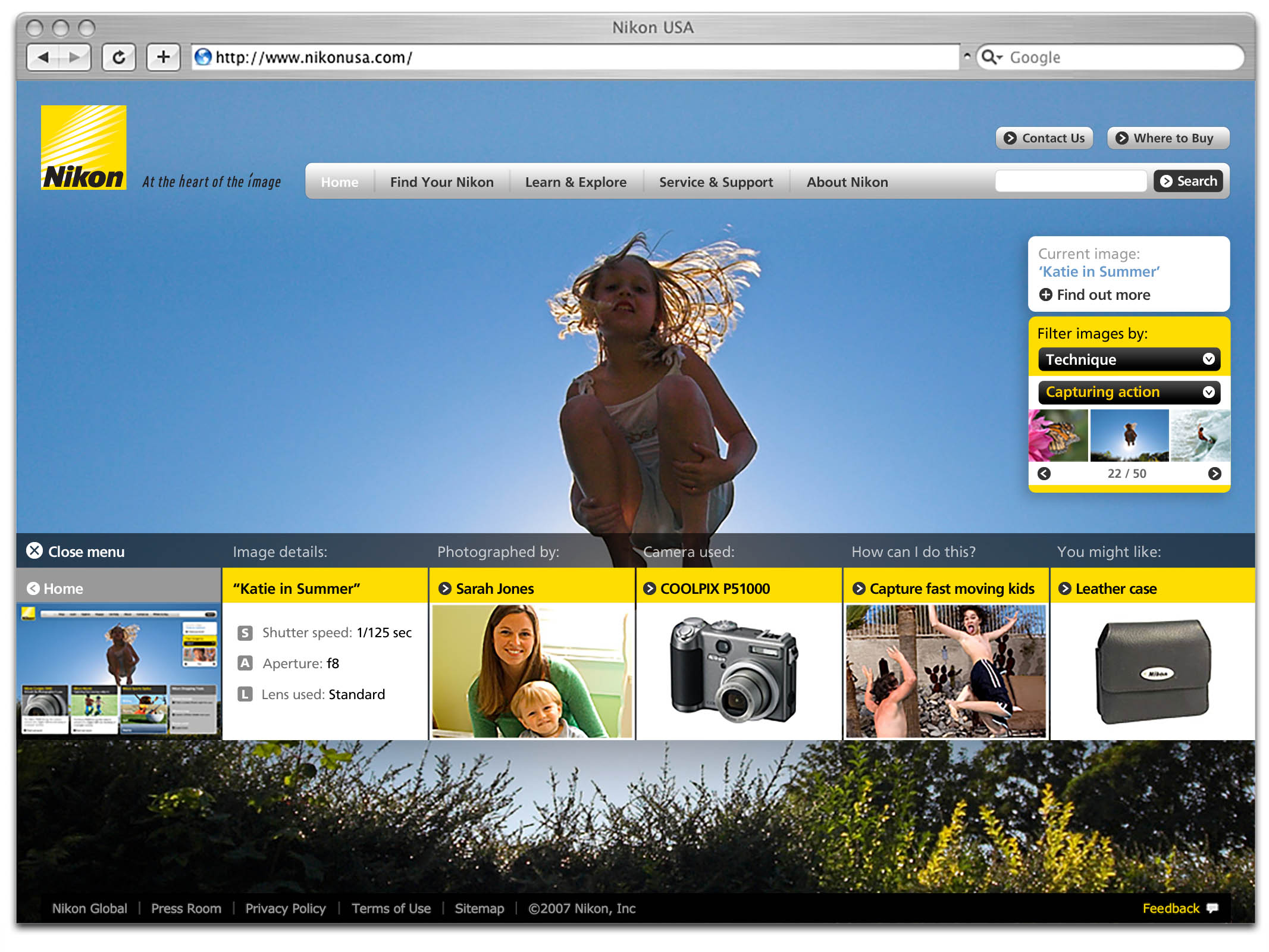 The concept in this redesign was to enable customers to find information about Nikon products, learn new techniques and be immersed in a rich experience that would inspire them to create better photos. By exploring the content through the photographs, users get to see the real results that they can achieve by using these great cameras.