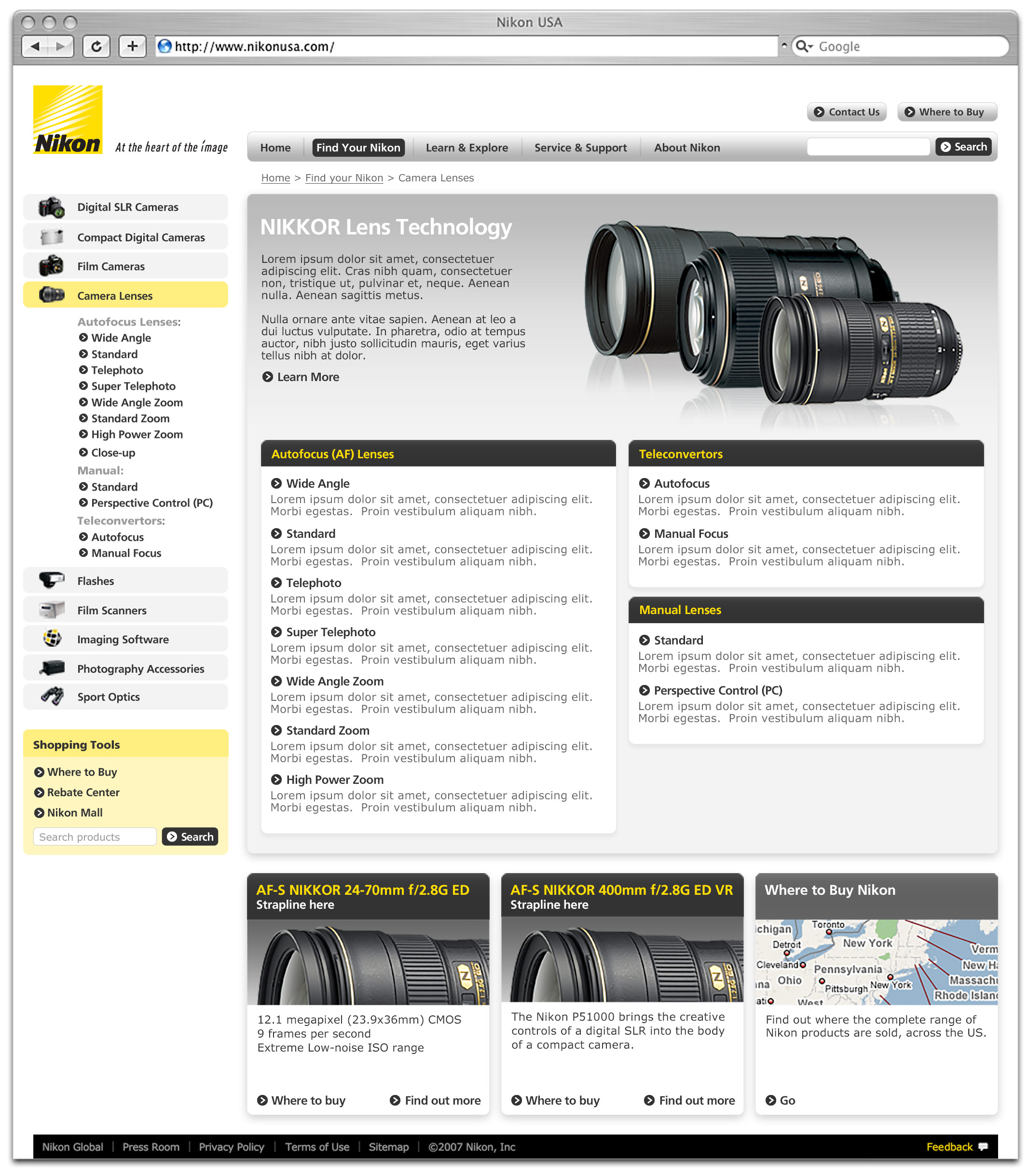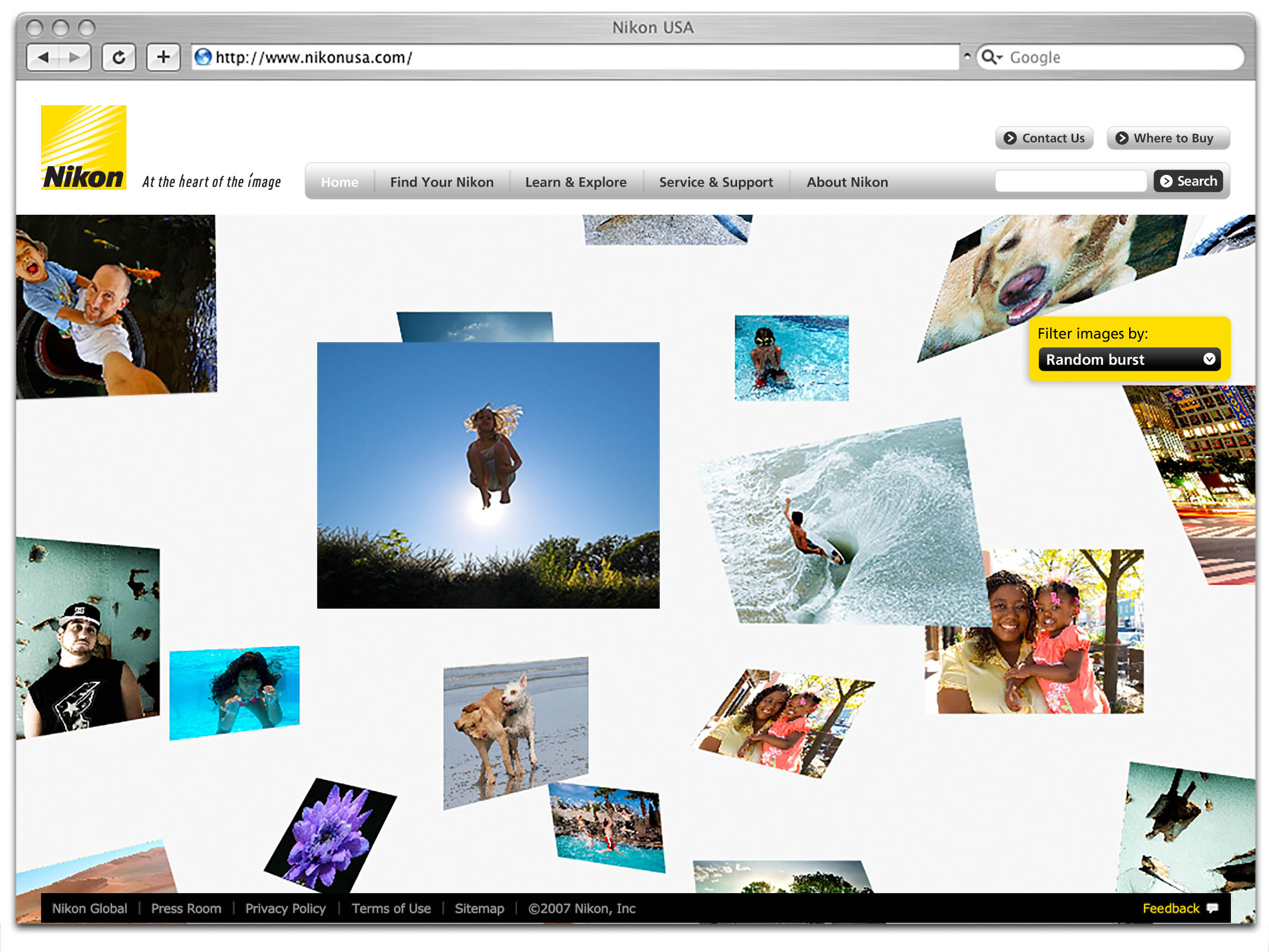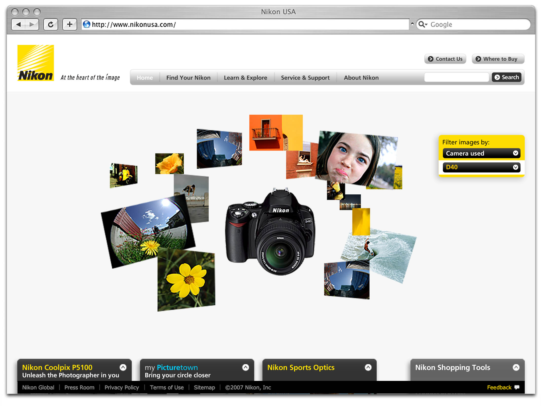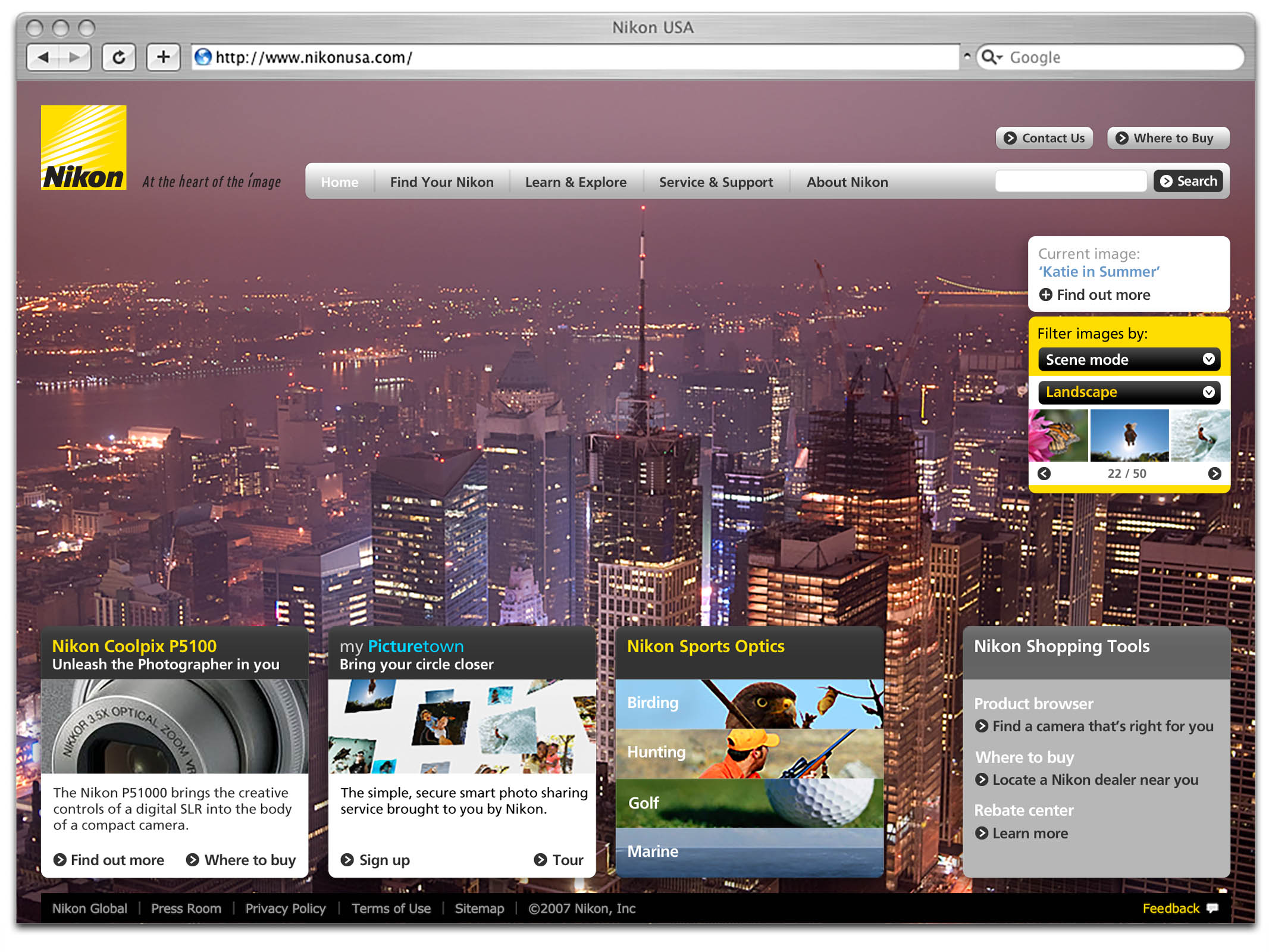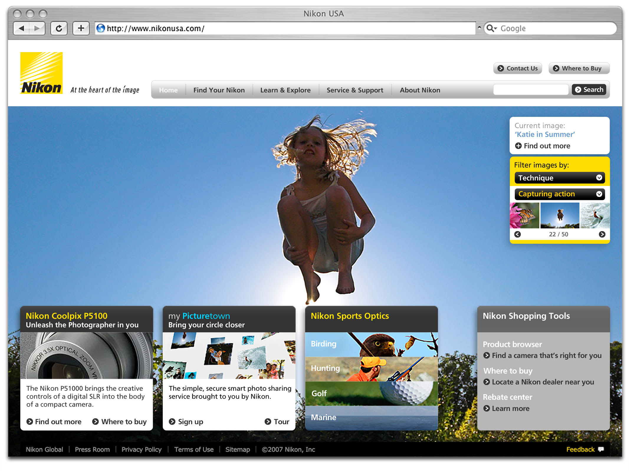 The concept in this redesign was to enable customers to find information about Nikon products, learn new techniques and be immersed in a rich experience that would inspire them to create better photos. By exploring the content through the photographs, users get to see the real results that they can achieve by using these great cameras.