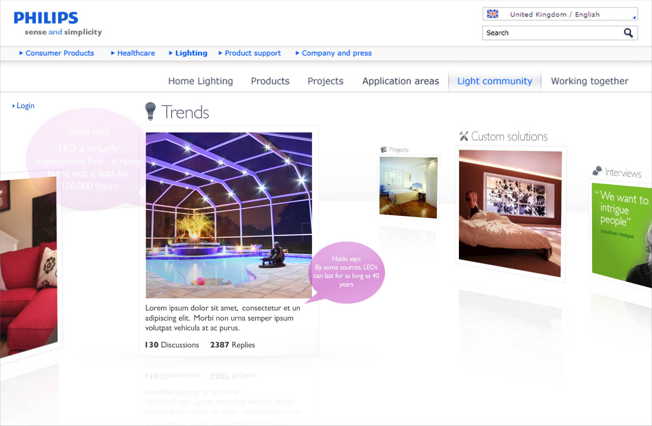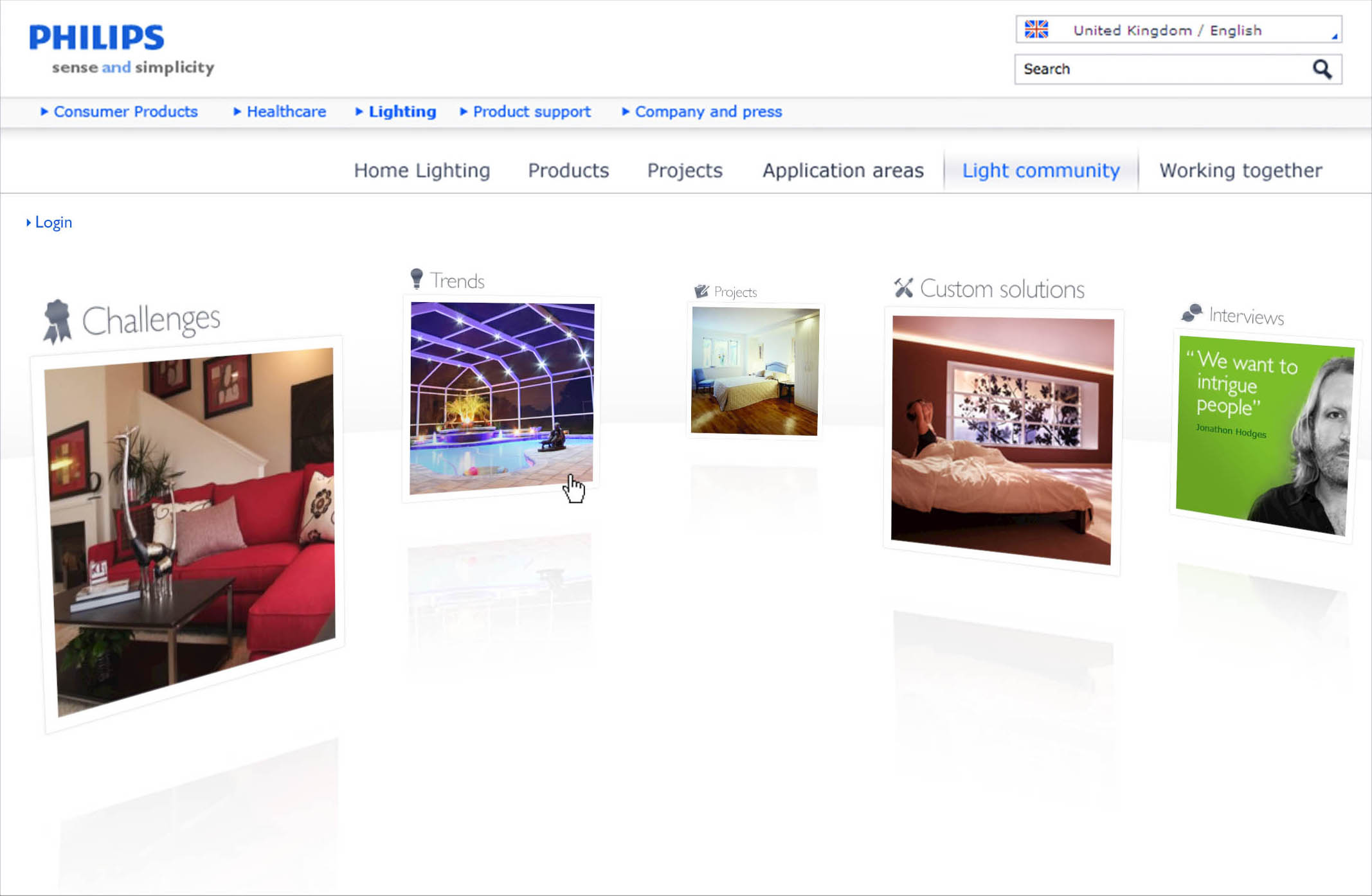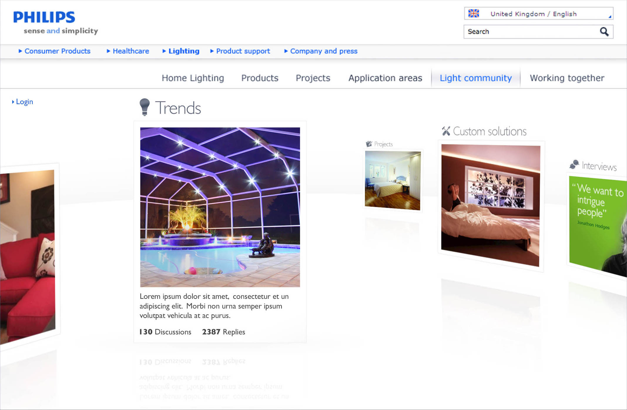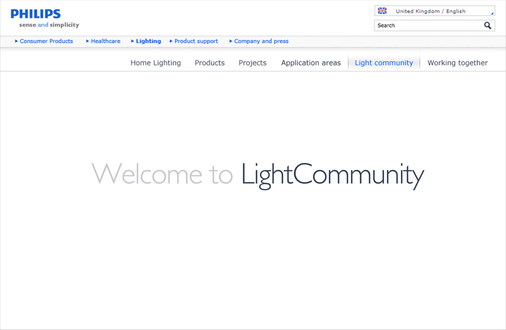 Philips developed the concept of the White Space section for its redesigned website and was looking to establish the number one B2B lighting web site. They wanted a cutting edge site that facilitated sharing and collaboration within the professional lighting community and with Philips.LightCommunity Website