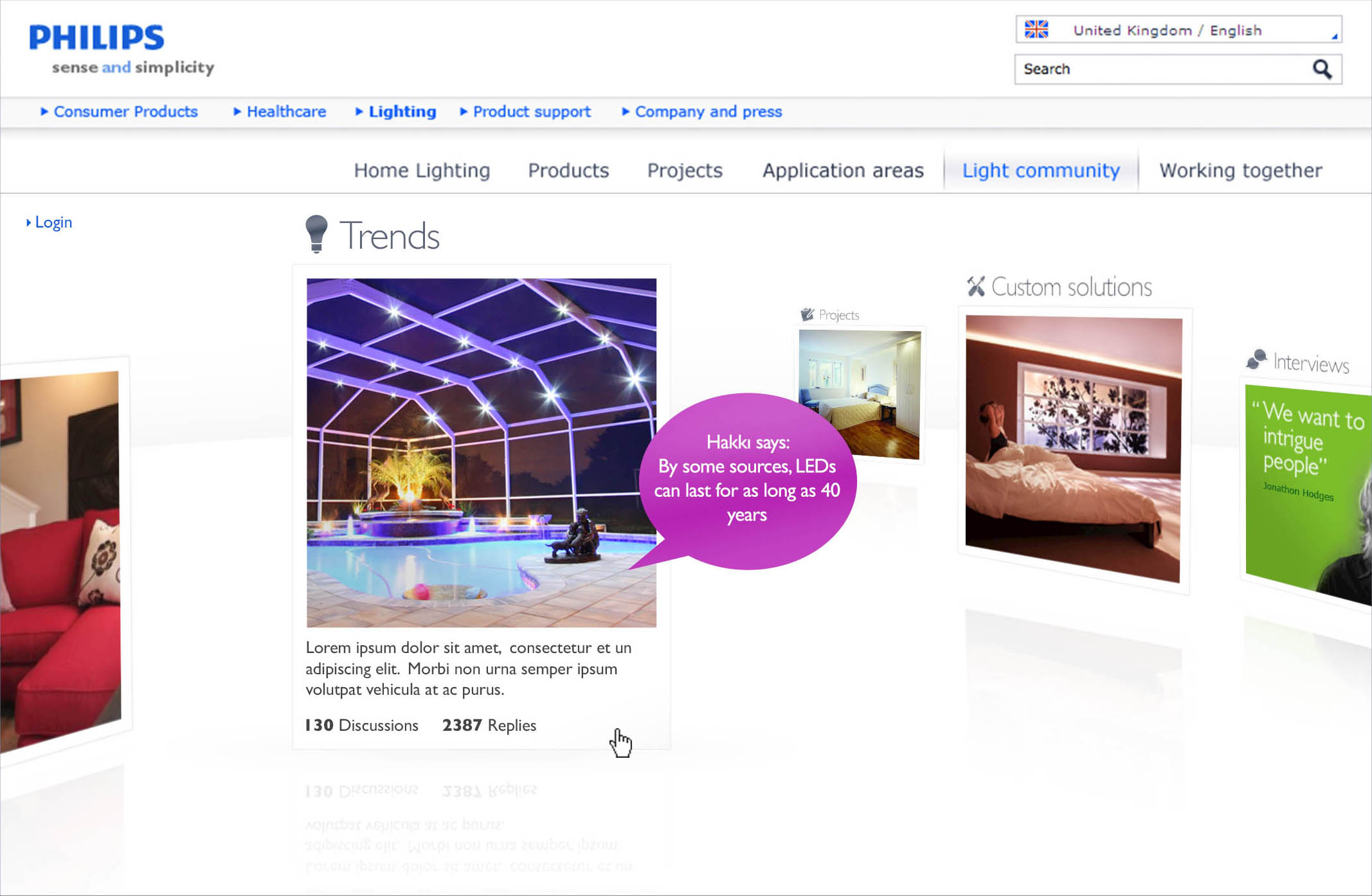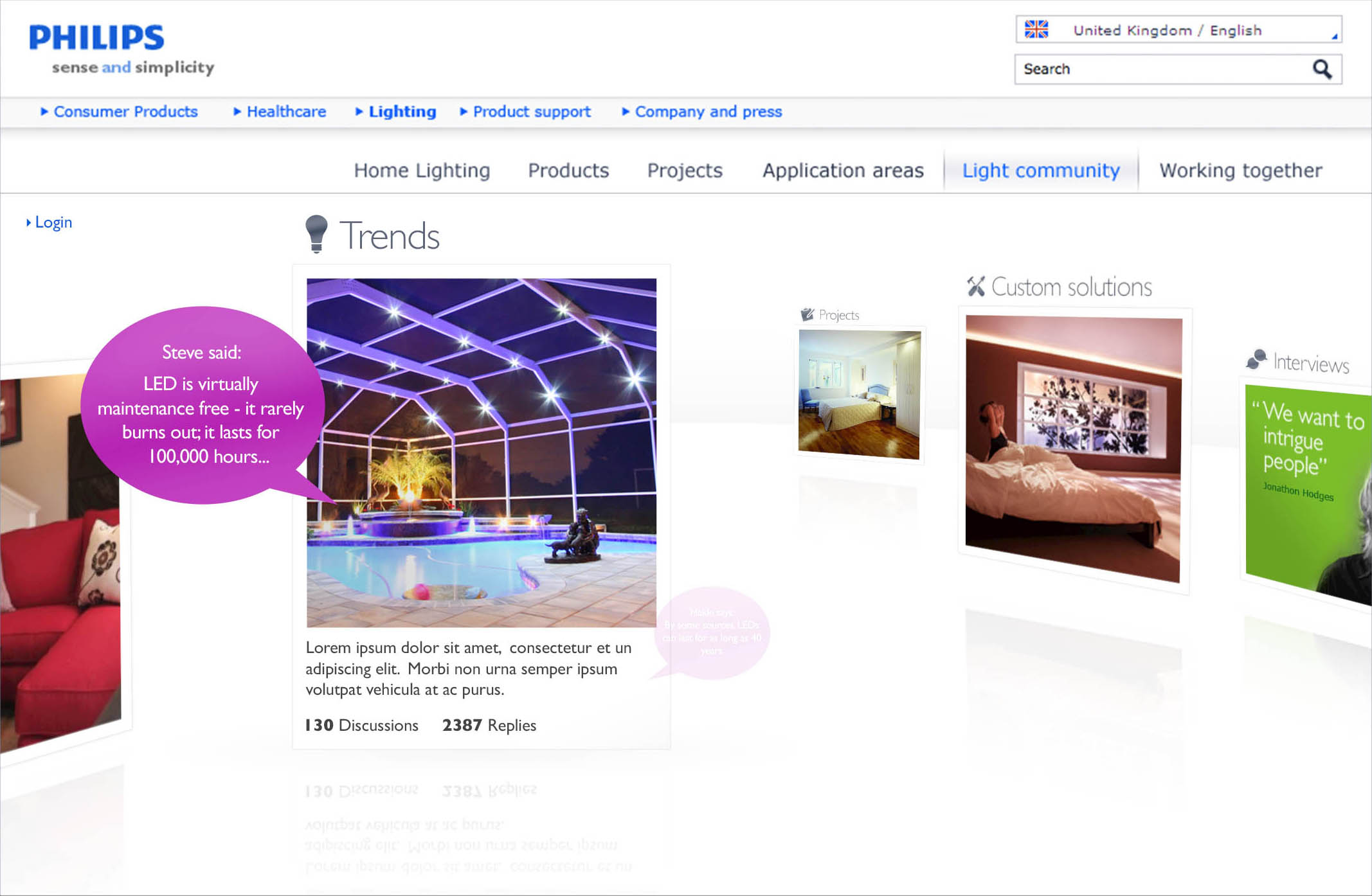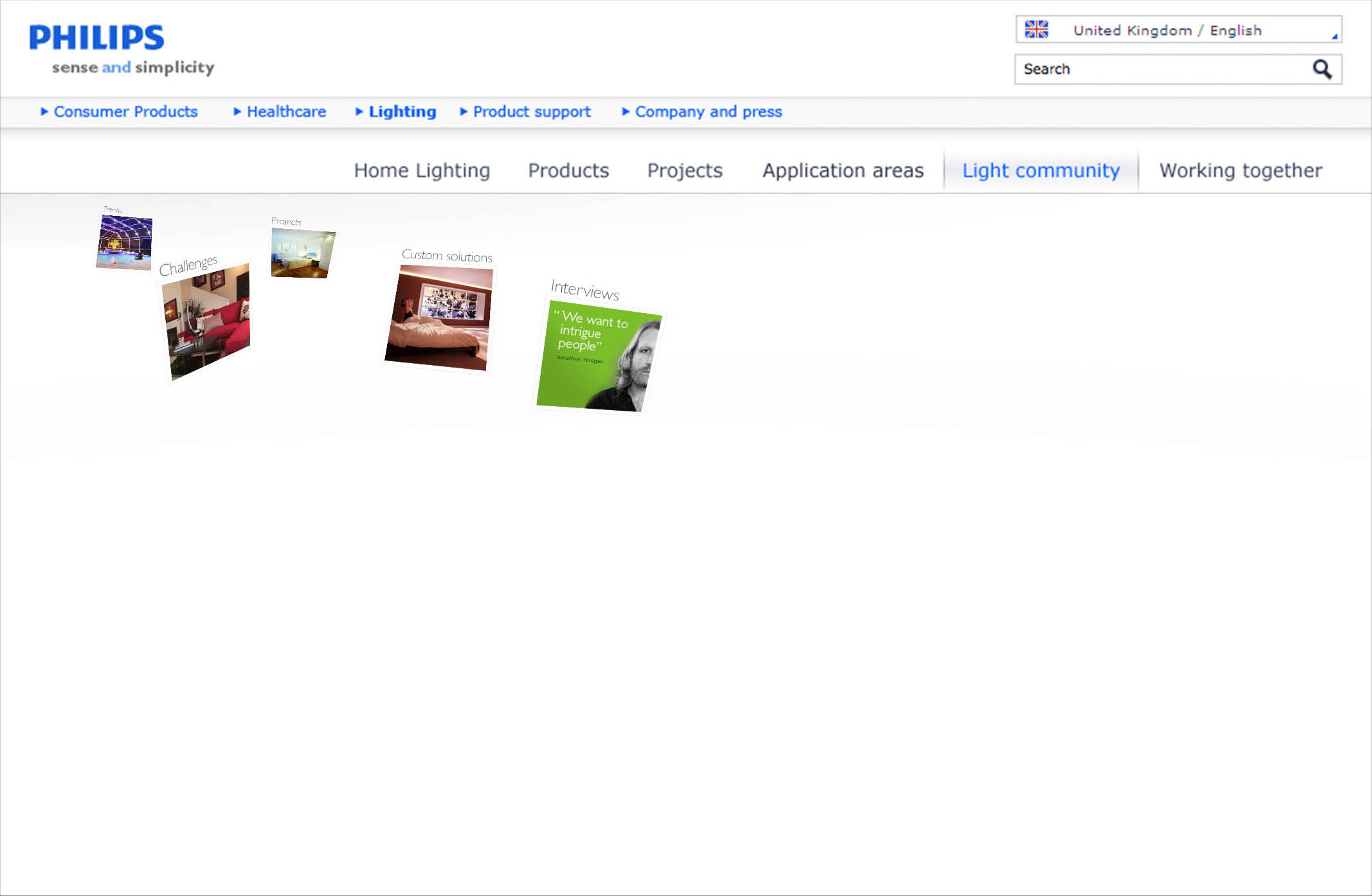 Philips developed the concept of the White Space section for its redesigned website and was looking to establish the number one B2B lighting web site. They wanted a cutting edge site that facilitated sharing and collaboration within the professional lighting community and with Philips.LightCommunity Website