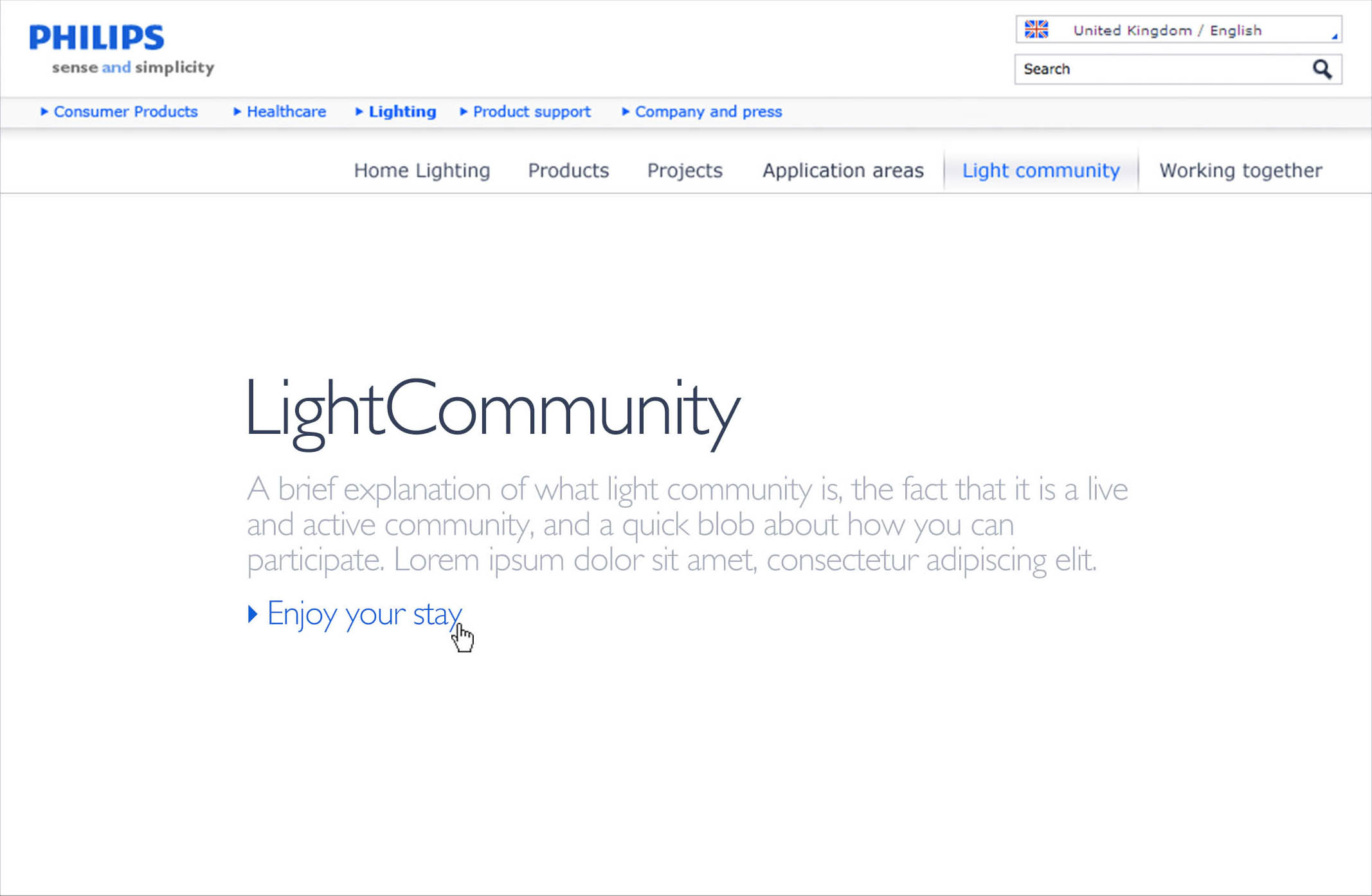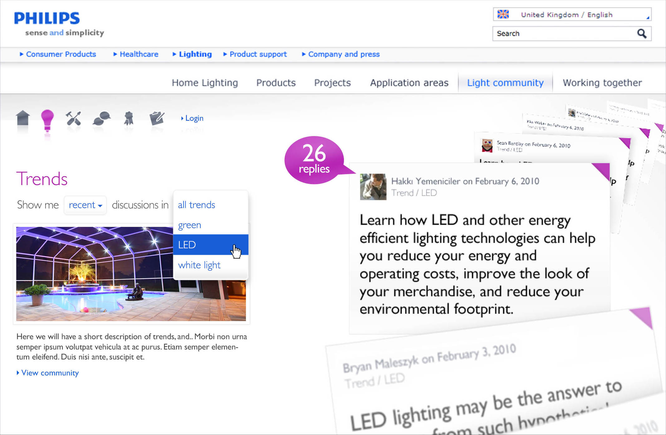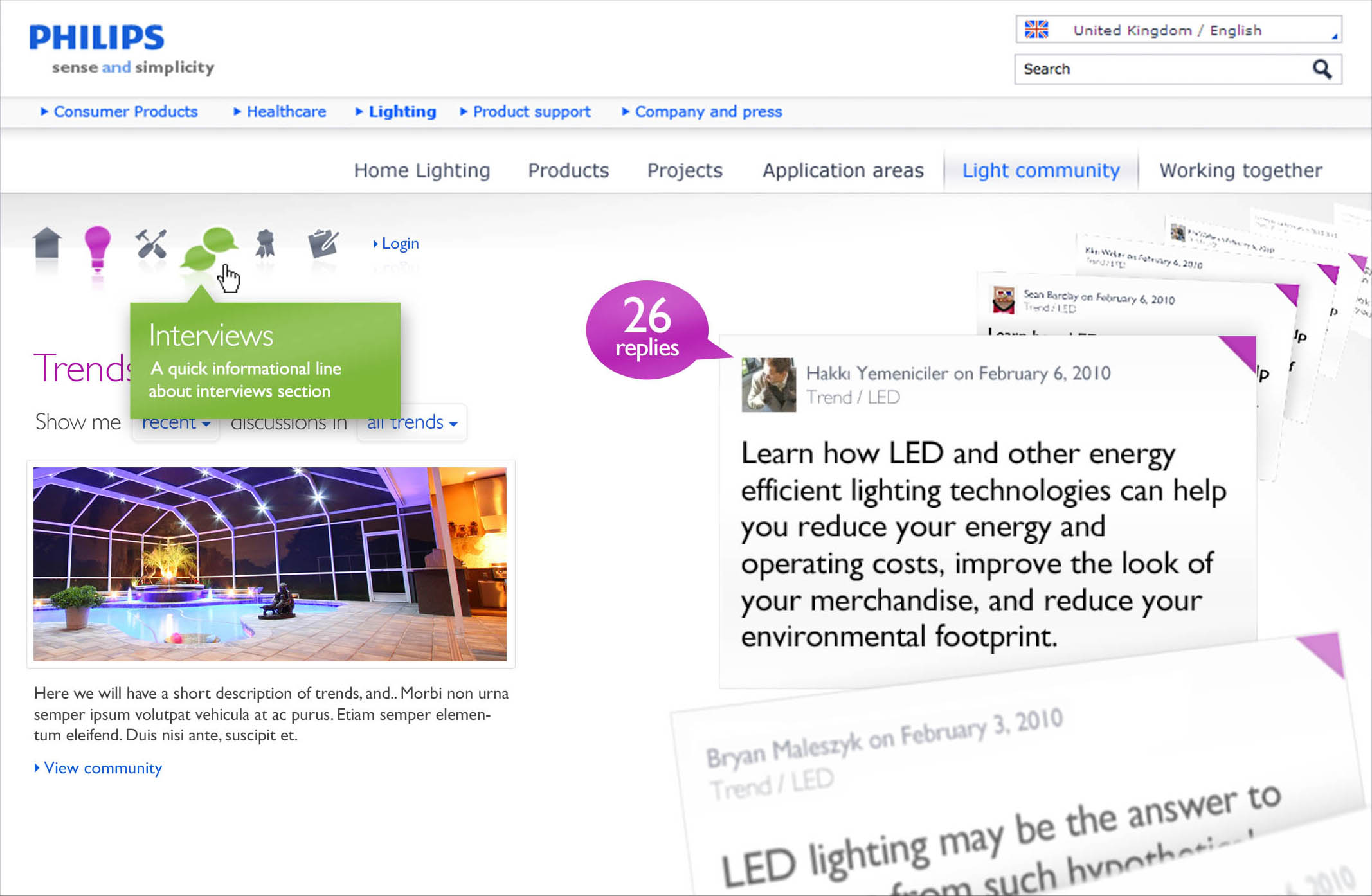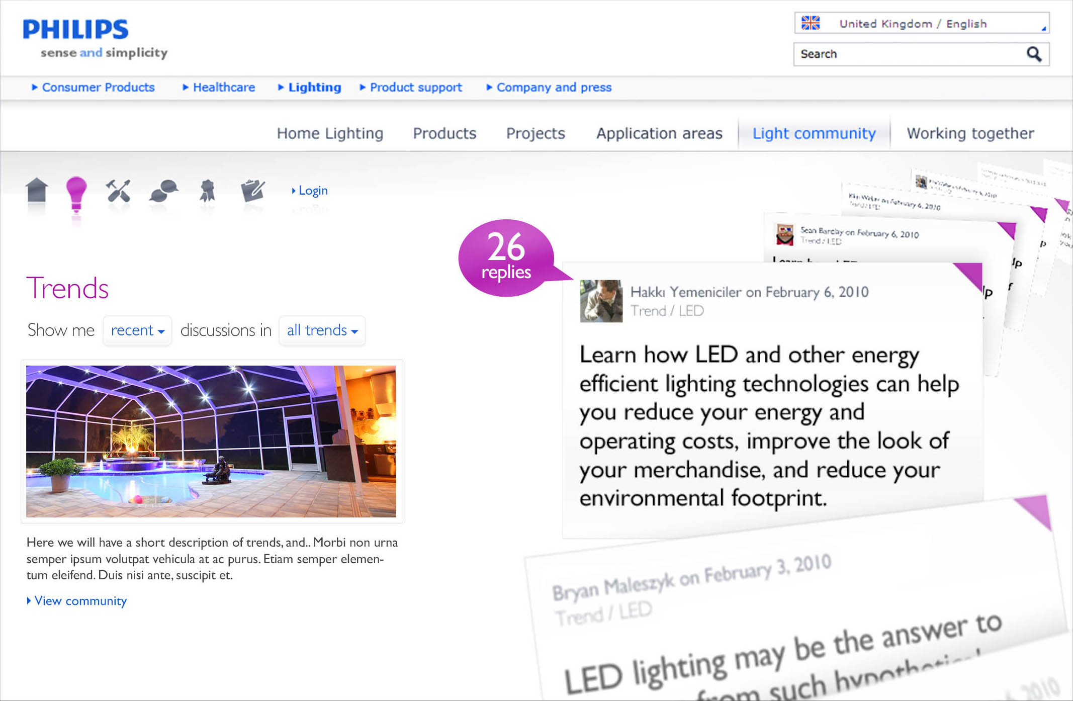 Philips developed the concept of the White Space section for its redesigned website and was looking to establish the number one B2B lighting web site. They wanted a cutting edge site that facilitated sharing and collaboration within the professional lighting community and with Philips.LightCommunity Website