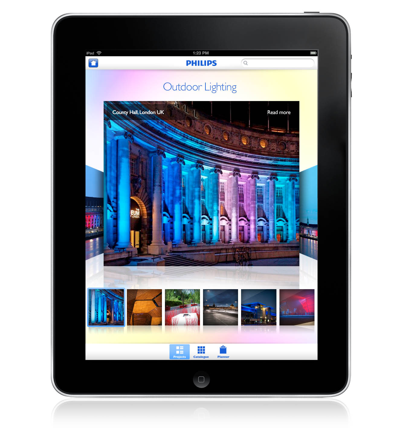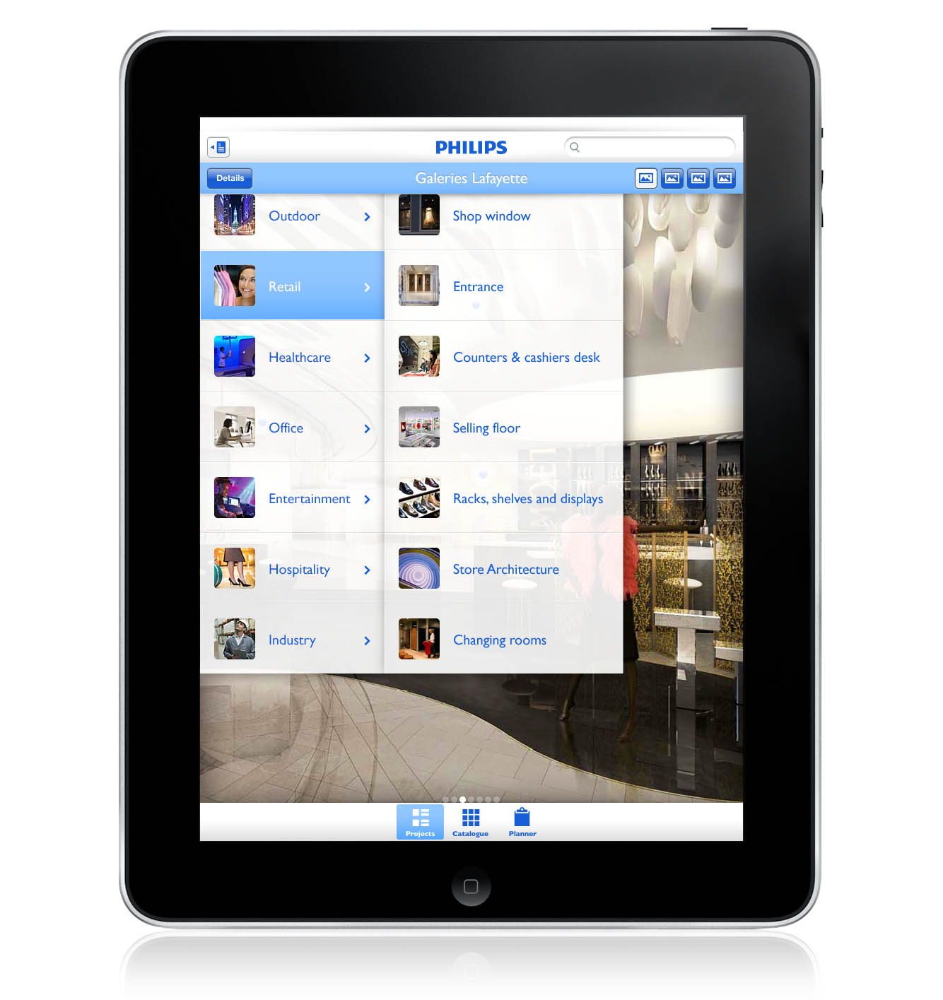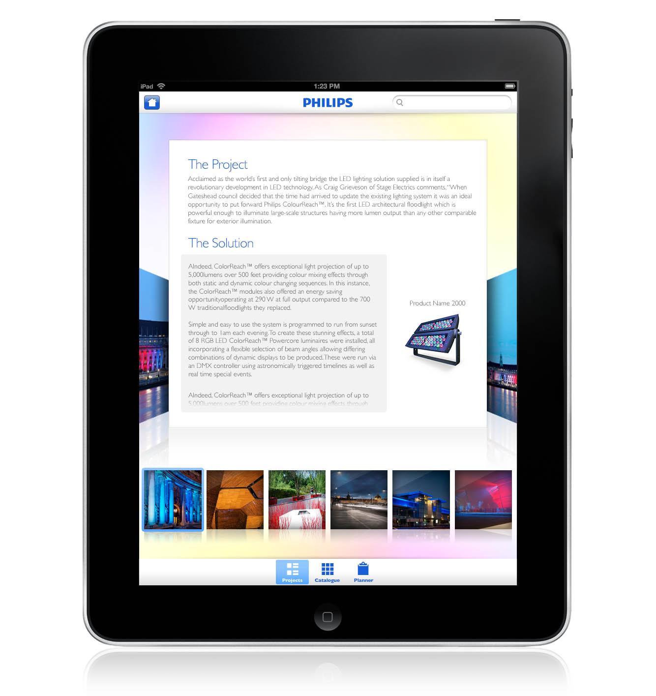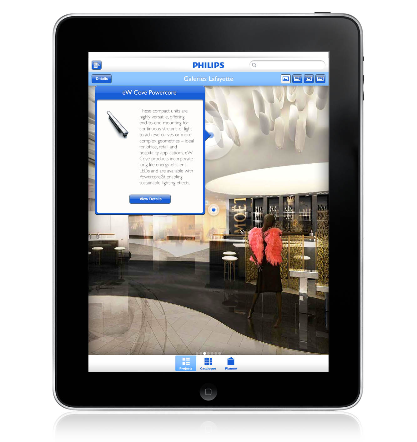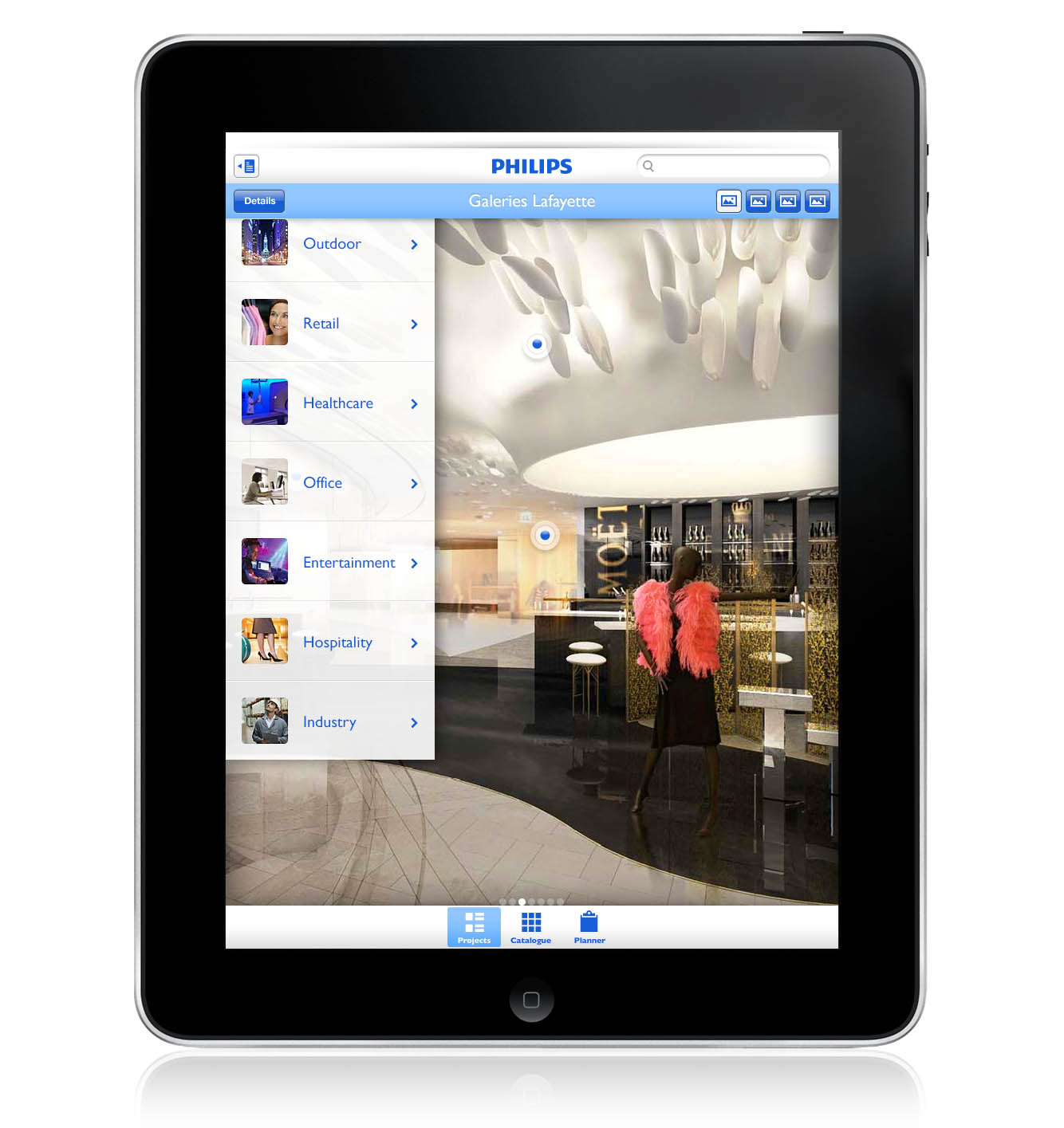 The app was aimed to provide an in depth interactive look at the lighting products and their applications.