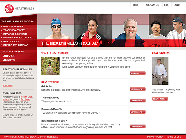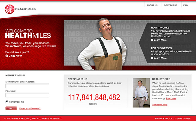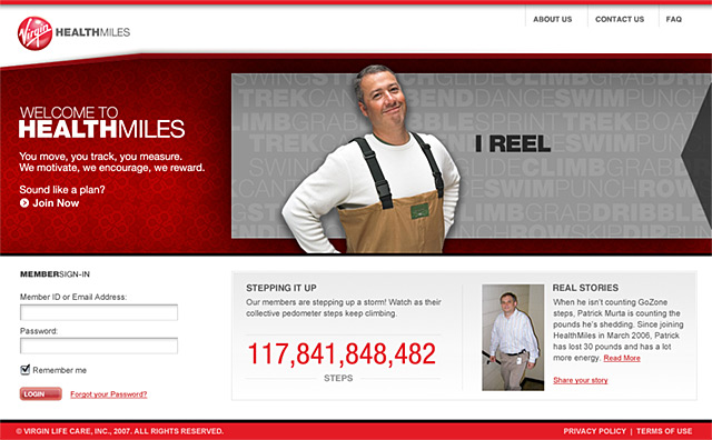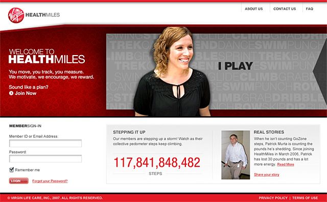 The creative concept behind designing Virgin HealthMiles (formerly known as Virgin Life Care) was to design a site that focused on the human element and appealed to everybody on a personal level regardless of age and fitness level that motivated consumers to engage in the process of getting and staying healthier by being more active.